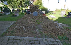 Was blieb: Eine seit langem ungepflegte Grabstelle auf dem Alten Friedhof, für die sich niemand mehr zuständig fühlt. (Aktuell wieder eingewachsen).